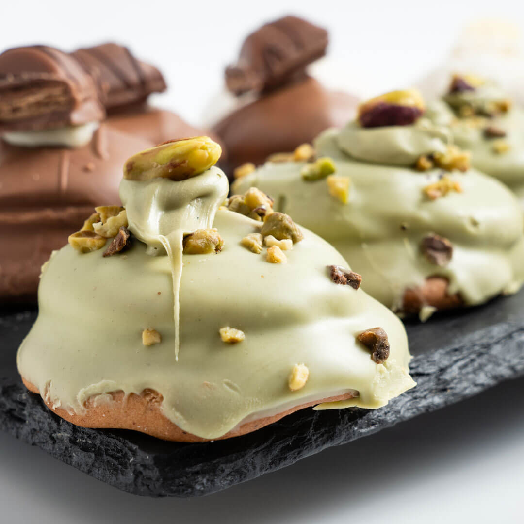 Glassa: pasta pura di pistacchio, latte intero in polvere, cioccolato bianco 10% (zucchero, burro di cacao, latte intero in polvere), lattosio, siero del latte in polvere, emulsionante (lecitina di soia), aromi, granella di pistacchio.